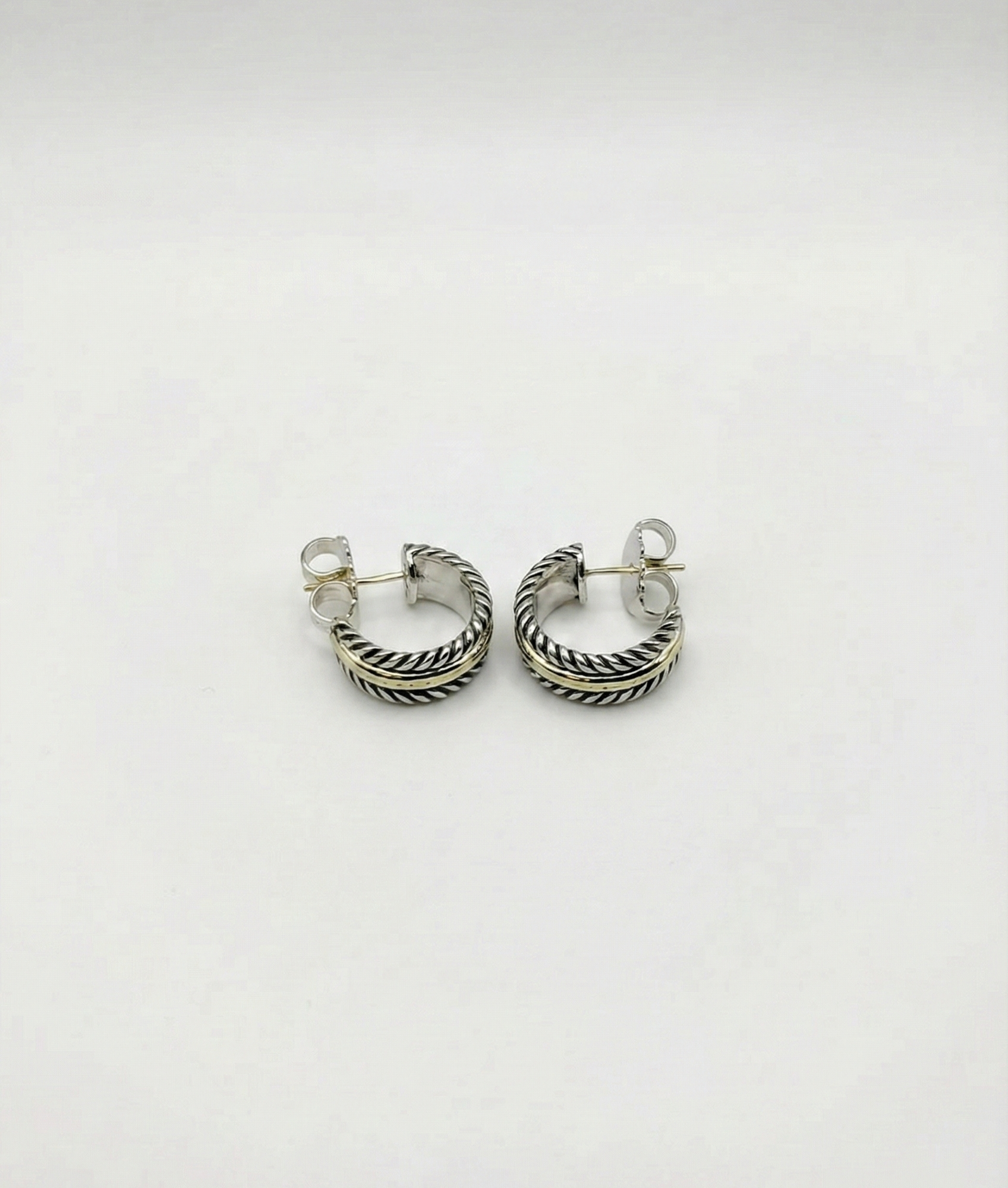 Classic Twist Crown Hoops blend timeless elegance with a refined, luminous presence. Crafted in Sterling Silver .925, their rope-twist texture is enhanced by a polished 14K Yellow Gold center band for a sophisticated contrast. The mini-hoop silhouette hugs the lobe with comfort and style. Finished with a solid 14K post, hypoallergenic, and the Divine 925 Hallmark for guaranteed quality and durability.